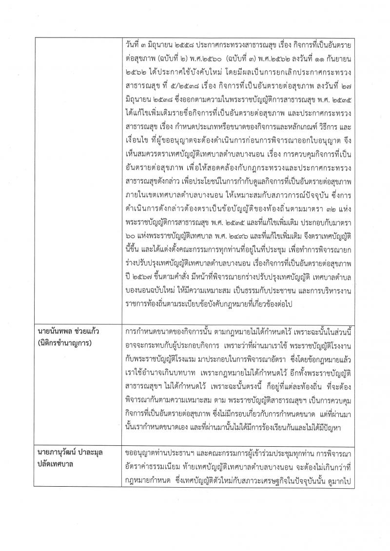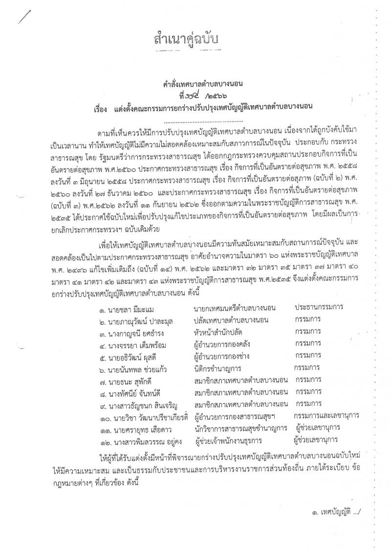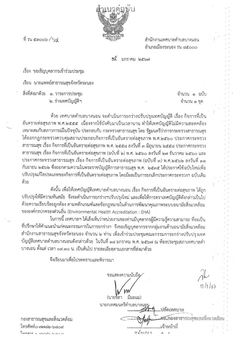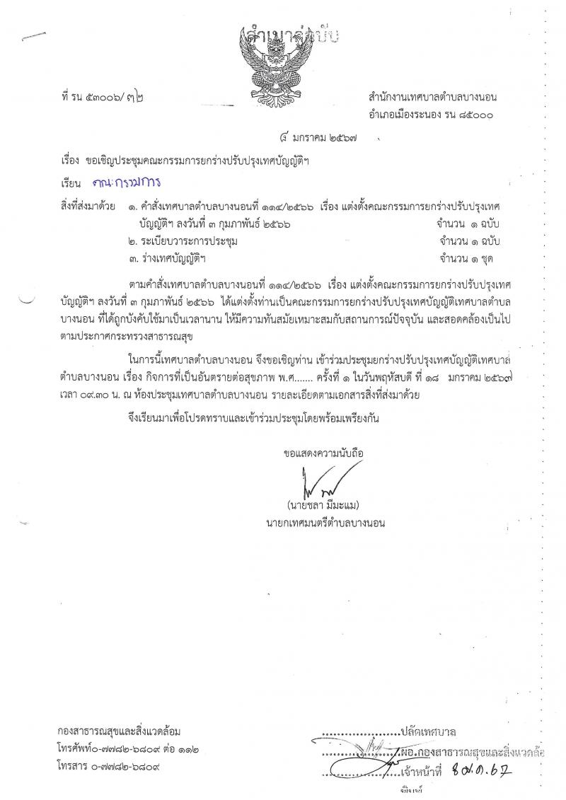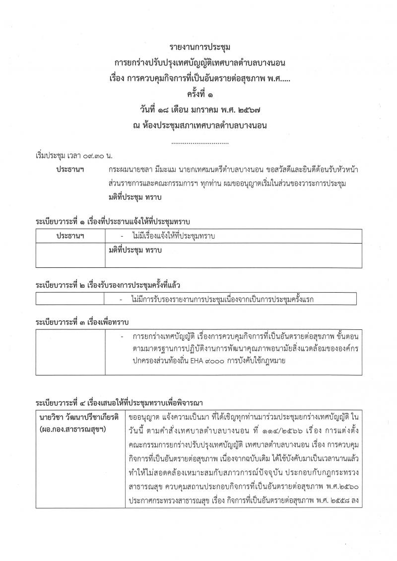 วันพฤหัสบดีที่ 18 มกราคม 2567 เวลา 09.30 น. เทศบาลตำบลบางนอนประชุมคณะกรรมการยกร่างปรับปรุงเทศบัญญัติเทศบาลตำบลบางนอน เรื่อง กิจการที่เป็นอันตรายต่อสุขภาพ ครั้งที่ 1 ประจำปีงบประมาณ 2567 ณ ห้องประชุมสภาเทศบาลตำบลบางนอน