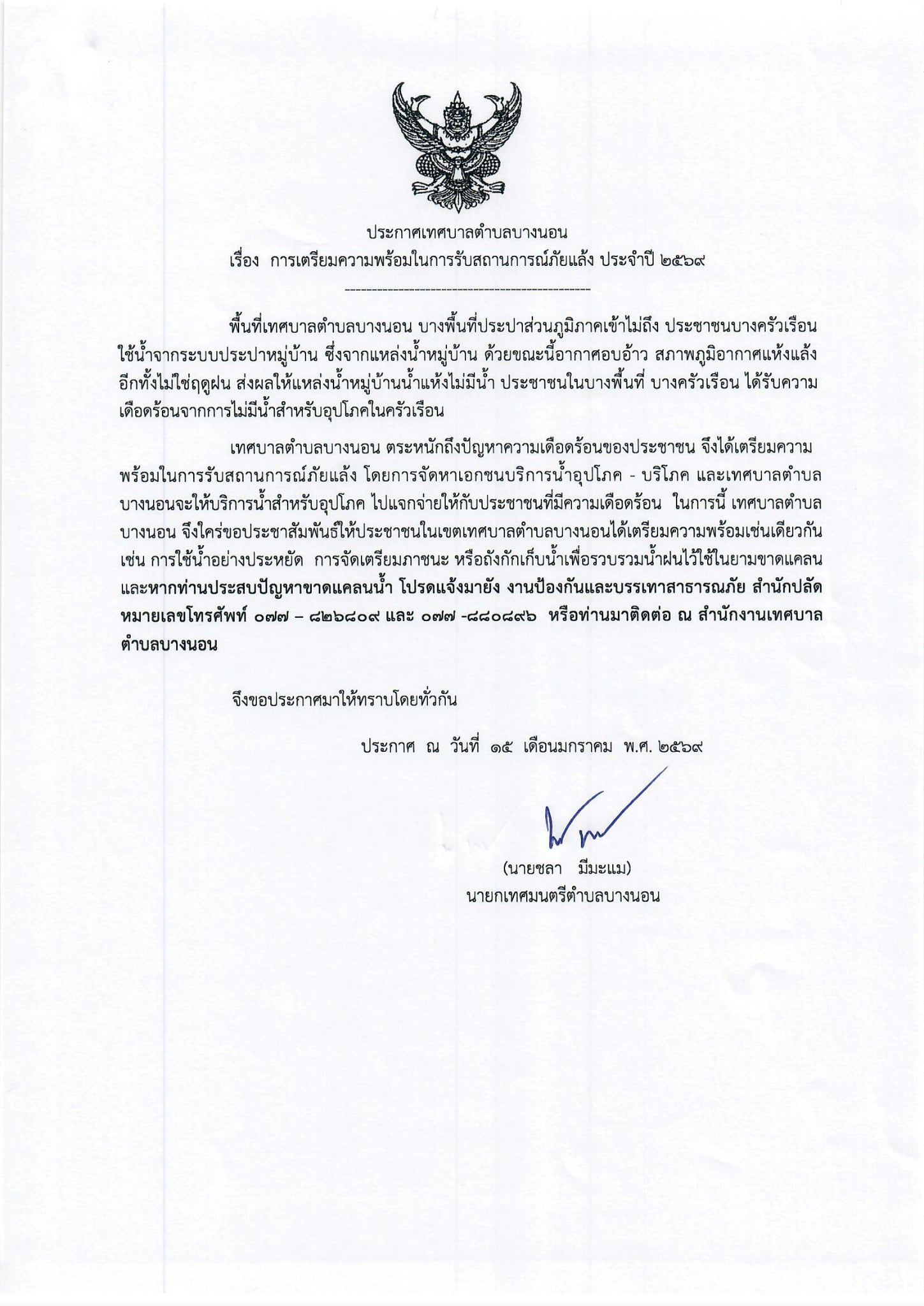 ประกาศ การเตรียมความพร้อมในการรับสถานการณ์ภัยแล้ง ประจำปี 2569